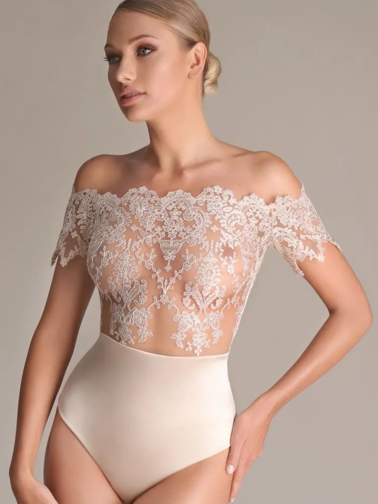 Der Satin Stringbody von Prelude Milano ist Lingerie Made in Europe. Das edle Teil besteht aus glänzendem Stretchsatin in einem exquisiten goldcreme und einer transparenten, bestickten Tüllspitze. Der Body hat einen weiten Carmen Ausschnitt und kurze Ärmel. Im Rücken ist eine zierende Knopfreihe angebracht. Der Body hat einen seitlichen Reißverschluss und kann unten hinten geöffnet werden.