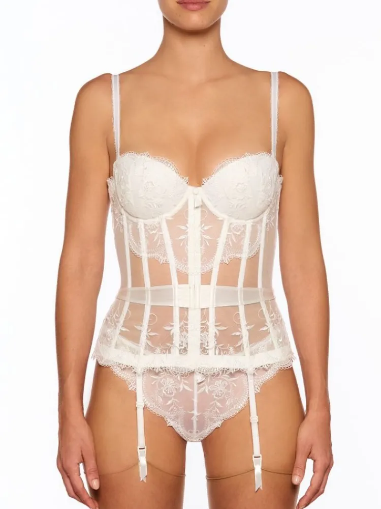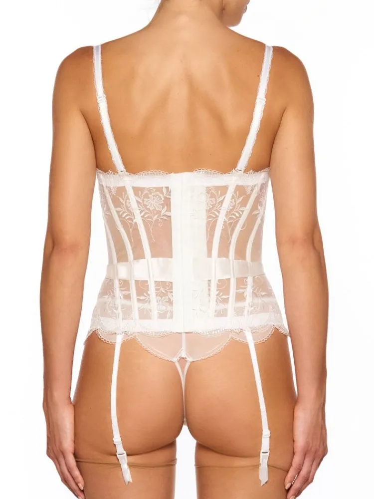 Das Torselett Cravache ist eine luxuriöse Spitze Lingerie der französischen Edel-Dessous Marke Millesia. Die Corsage mit Strapsen hat leicht ausgeformte, gefütterte 3/4-Cups. Die Schalen mit Bügel sind auf der Außenseite mit bestickter Tüllspitze mit floralen Blütenmotiven bezogen, welche am Rand in eine Art Richelieu Stickerei übergeht.