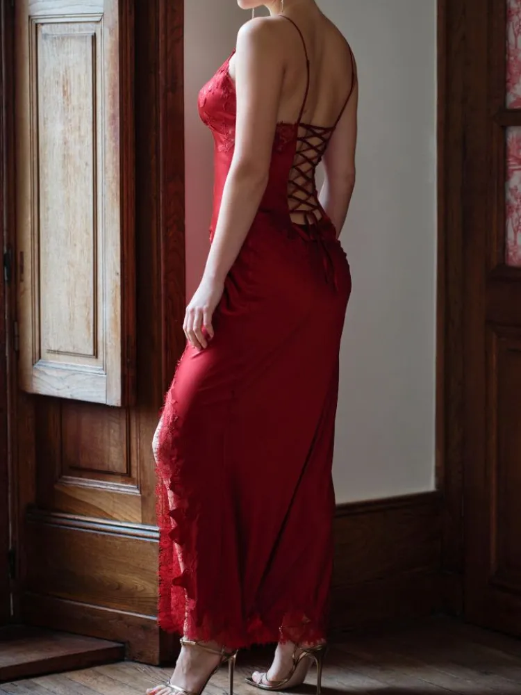 Dieses lange Seidennachthemd hat einen üppigen Besatz mit feiner Blumenspitze am Decolleté und am Saum. Ein Highlight ist der geschnürrte Rücken. Es ist ca. 140 cm lang und wird in den Größen 36 bis 42 angeboten (deutsche Damengrößen). Bei uns ist dieses Nachtkleid in Rot mit roter Spitze (tone in tone) oder in Rosa mit einer schwarzen Spitze zu erhalten.