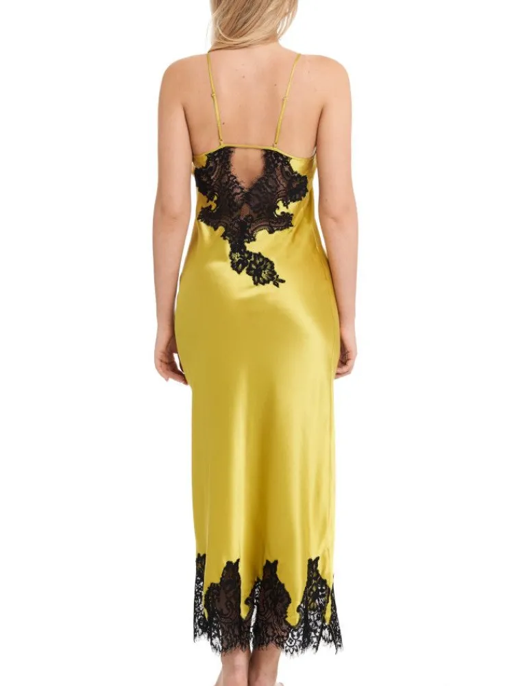 Dieses Modell in zeitlosem Schwarz oder feinem Naturweiß und modischem Goldgrün ist in den Größen 36 bis 48 (deutsche Größen) erhältlich. Zusätzlich gibt es saisonal verfügbare Modefarben. Das lange Neglige Mailin hat verstellbare Spaghettiträger, unten seitliche Schlitze am Saum und eine raffinierte Rückengestaltung.