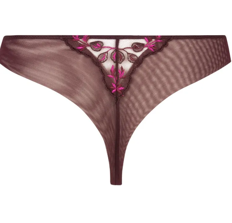 Der bezaubernde String ist vorne aus bedruckter Seide und hat oben einen bestickten Tüllrand. Hinten ist der feine String komplett aus transparentem Tüll, der die Haut verlegen vorschimmern lässt. Eine kleine, V-Förmige Stickerei an der Hinterseite rundet den String ab. Der Schritt hat einen weichen Baumwollzwickel. Das edle Teil gibt es in der Farbe AVEU PETALE, einem dunklen Violettton mit bunten Blumen. Auf der Seide sind die Blumen draufgedruckt, auf dem Tüll draufgestickt. Dieses detailreiche Zusammenspiel der unterschiedlichen Materialien und Akzente formt sich zu einem raffinierten Wäscheslip, der sowohl für den Alltag als auch für besondere Anlässe perfekt geeignet ist. Aus dieser zarten Kollektion gibt es weitere, ergänzende Kombinationsteile seperat in unserem Shop.