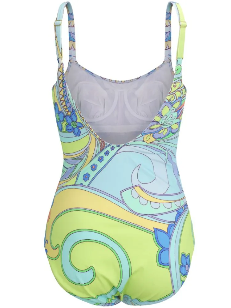 Diese Swimwear ist mit einem bunten Mustermix-Print aus floralen- und graphischen Mustern bedruckt. Der Badeanzug ist bei uns in den Größen 38 bis 46 in einem B-Cup erhältlich. Da dieses Teil zur modischen Sommerkollektion von Fürstenberg gehört, sind ausverkaufte Größen leider nicht nachbestellbar.