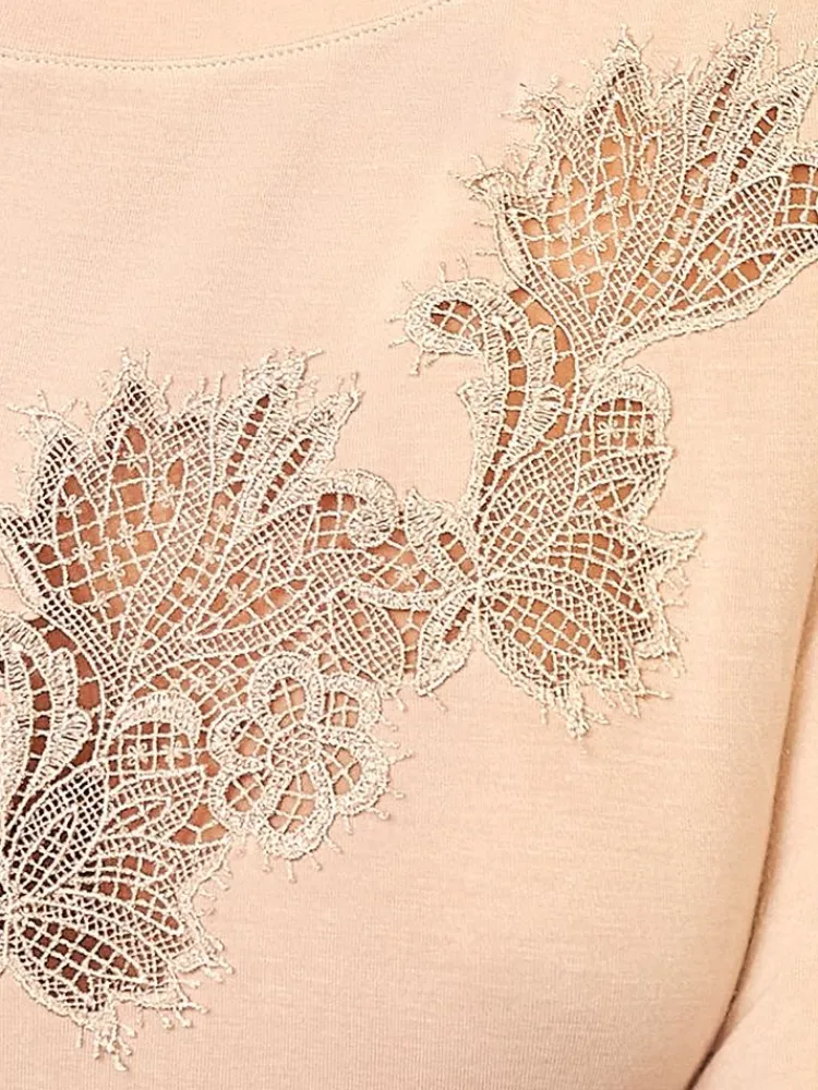 Der Pyjama Giselle hat ein Oberteil mit langen Ärmeln und rundem Ausschnitt. Das Oberteil ist mit einer Spitze im floralen Design verziert. Die im Lieferumfang enthaltene Hose ist lang geschnitten und hat einen Gummibund.