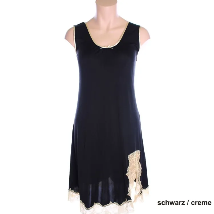 Das Träger Unterkleid hat breite Träger und ist etwa 90 cm lang. Am Decolleté ist es mit Seidensatin eingefasst und der seitliche Schlitz ist mit Spitze verziert. Durch den klassisch schlichten Schnitt und das angenehm hautfreundliche Material ist es sowohl als Unterkleid oder als Nachthemd verwendbar. Diese Ware stammt aus einem Abverkauf und ist nur noch in den auswählbaren Größen verfügbar.