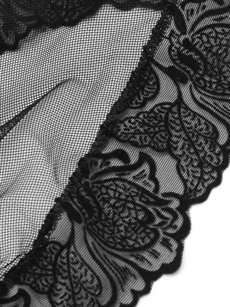 Der Tüllbody Tulipe von Cadolle ist ein eleganter Hauch von Nichts… Der Langarm Body besteht aus feinem, schwarzem Tüll und ist am Ausschnitt und den Ärmelenden mit einer Flockprint-Borte besetzt. Der Body ist ungefüttert und daher transparent. Er hat lange Ärmel, einen V-Ausschnitt auf Vorder- und Rückseite und wird im Schritt mit Druckknöpfchen geschlossen.