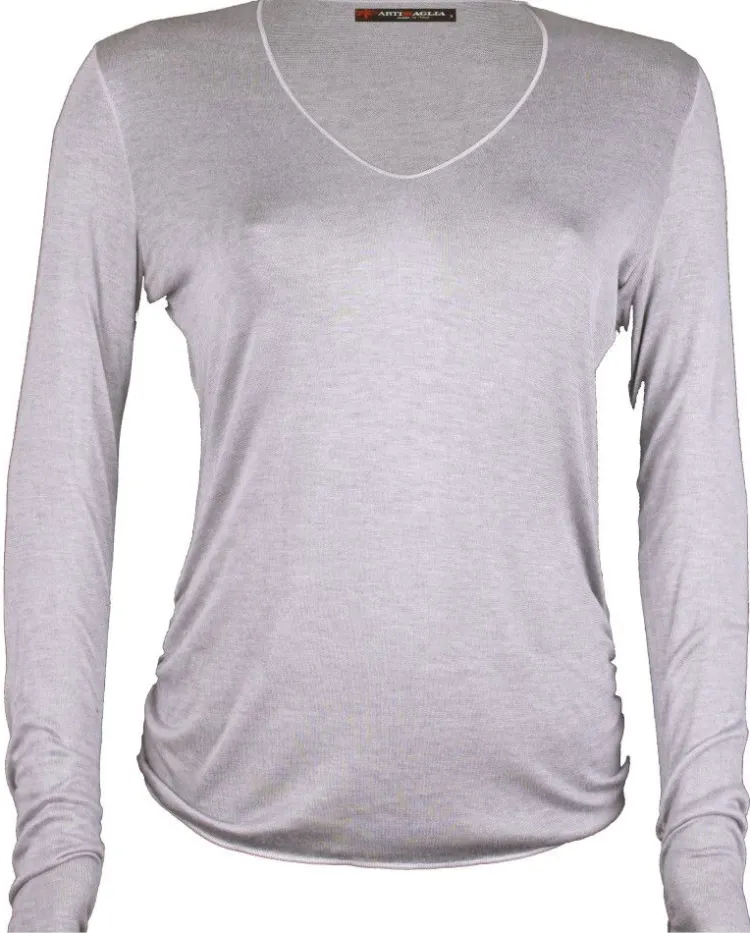 Das Langarm Shirt Voile besteht aus einem super weichen und hautsympathischen Jersey Voile aus 90% Viscose und 10% Kaschmir. Dieses edle Shirt hat lange Ärmel mit Raffungen, eine Gesamtlänge von ca. 65 cm und einen V-Ausschnitt. Seitlich unten ist es beidseitig wellig gerafft.