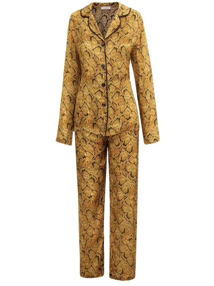 Luxuriöser Seidenpyjama Serpente mit langen Ärmeln. Dieser edle Seiden Pyjama ist aus bedrucktem, feinem Seidensatin gefertigt und kann als Schlafanzug oder Hausanzug getragen werden. Das Oberteil ist knöpfbar und hat eine Länge von ca. 68 cm. Der bequeme Schnitt und die langen Ärmel machen diesen Seiden Pyjama zu einem schicken und hautsympathischen Schlafanzug für das ganze Jahr.