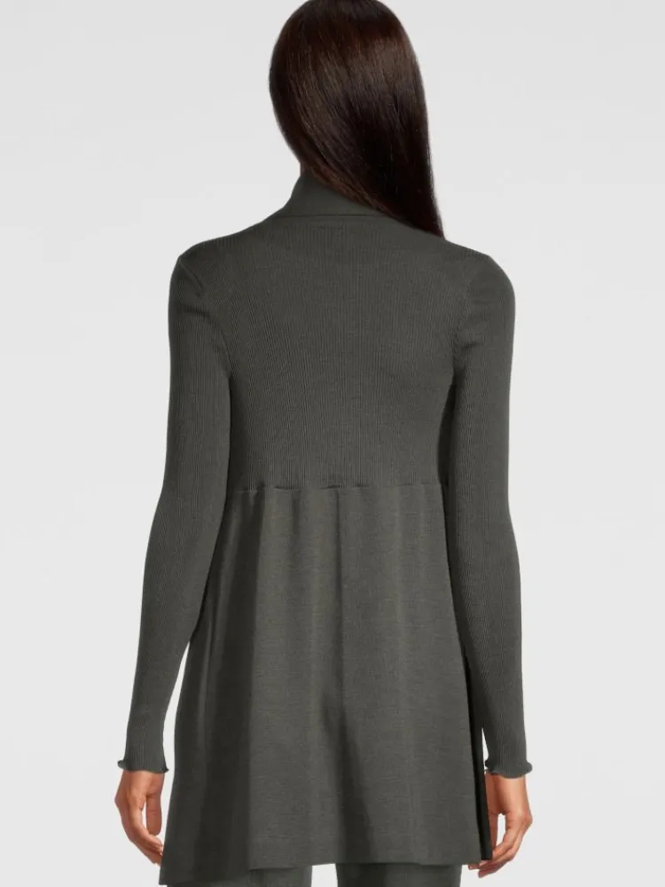Die Langarm Strickjacke Wolle-Seide besteht aus einem besonderen Materialmix aus geripptem und glatten Jersey aus 70% extrafeiner, tasmanischer Merinowolle und 30% Seide. Dieser edle Cardigan hat einen Reverskragen und die Gesamtlänge ist ca. 80 cm.