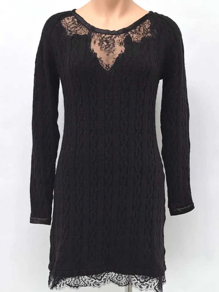 Das Strickkleid Saffran hat lange Ärmel und ist am Ausschnitt mit Spitze gestaltet. Dieses Strickkleid hat eine Gesamtlänge von ca. 80 cm und ist am unteren Saum mit Spitze benäht. Es kann als Minikleid oder auch als Longpullover getragen werden.