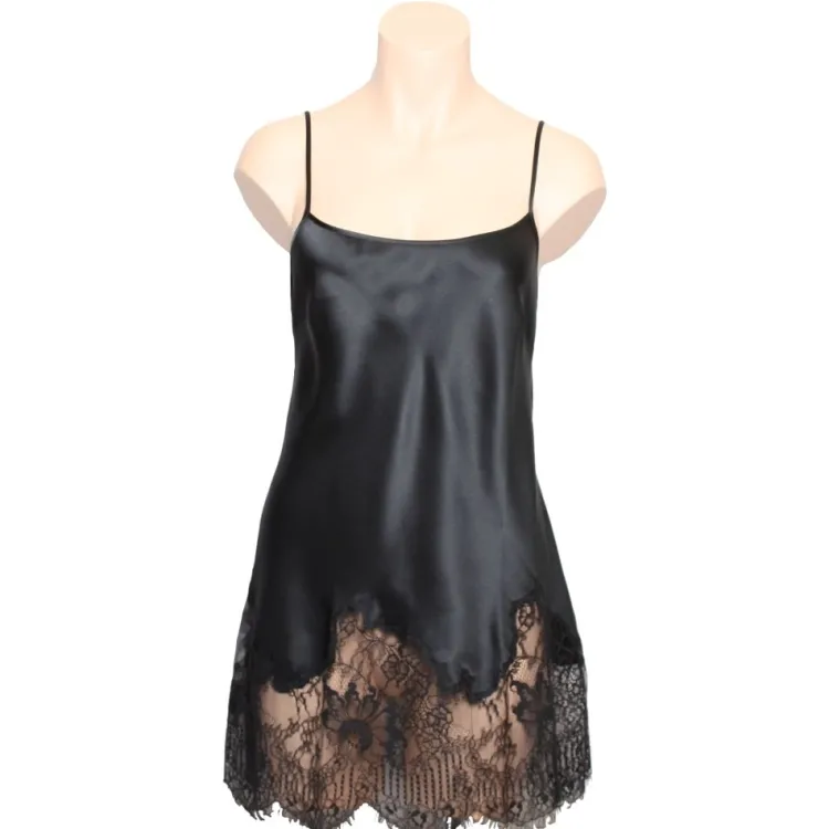 Die Mini Combinettes von Marjolaine sind mit nur 75 bis 80 cm Länge entweder sehr kurze Nachthemden oder länger geschnittene Tops. Je nach Lust und Laune kann man diese verführerische Seidenwäsche als Nachthemdchen tragen oder für „tagsüber“ als Oberbekleidung zu Hosen kombinieren. Raffiniert für Kombilooks ist bei diesen Teilen, dass der breite Spitzensaum unter darüber getragenen Pullovern oder Jäckchen hervorschaut…