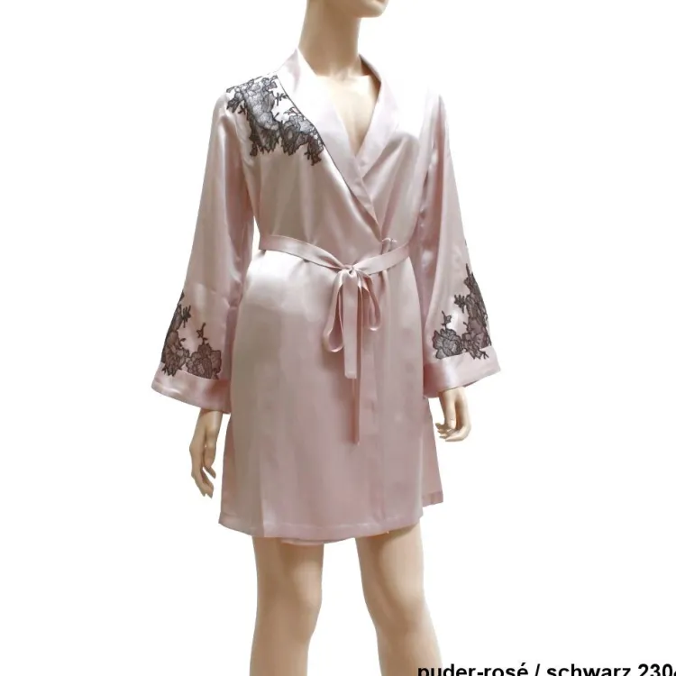 Ein kurzer Morgenmantel der Luxusklasse ist der Seidenkimono Baccarat der französischen Edel-Marke Marjolaine. Der edle Seidensatin wurde mit exquisiter Spitze zu einer aufregenden Nachtwäsche verarbeitet.