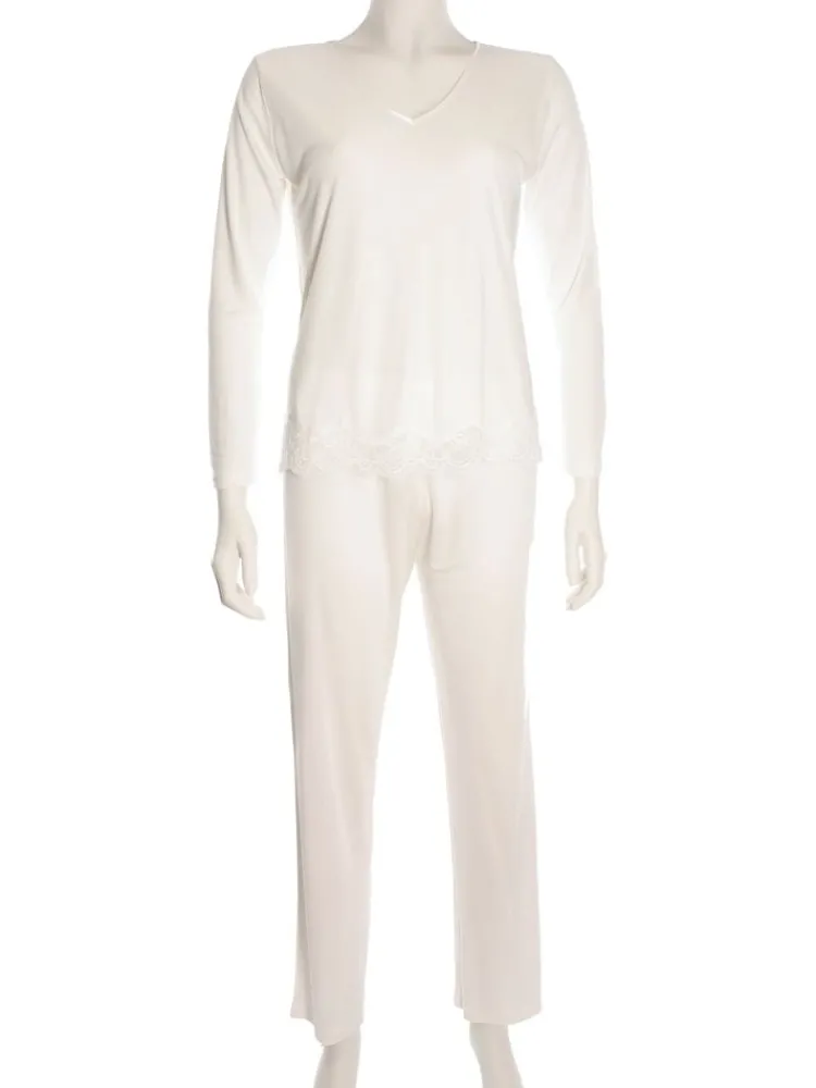 Dieser Schlafanzug aus Seidenjersey hat lange Ärmel und einen V-Ausschnitt. Der fließend weiche Jersey mit einem Seidenanteil von 60% verfügt über ein Flächengewicht von 150 g/m². Er ist elastisch und schmiegt sich schmeichelnd figurbetont an den Körper an. Der untere Saum des Oberteils ist mit einer breiten Spitze benäht. Die Hose ist mit einem bequemem Gummizug ausgestattet.