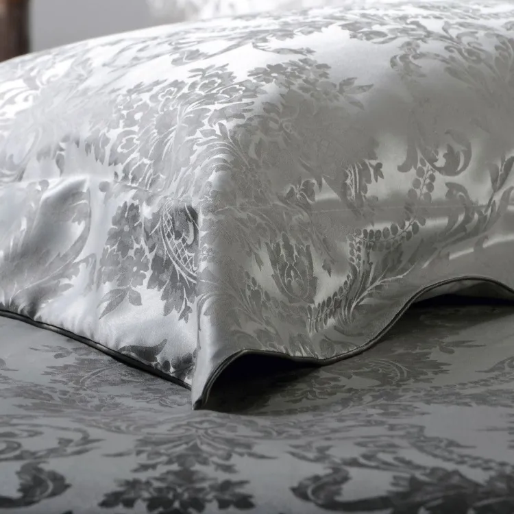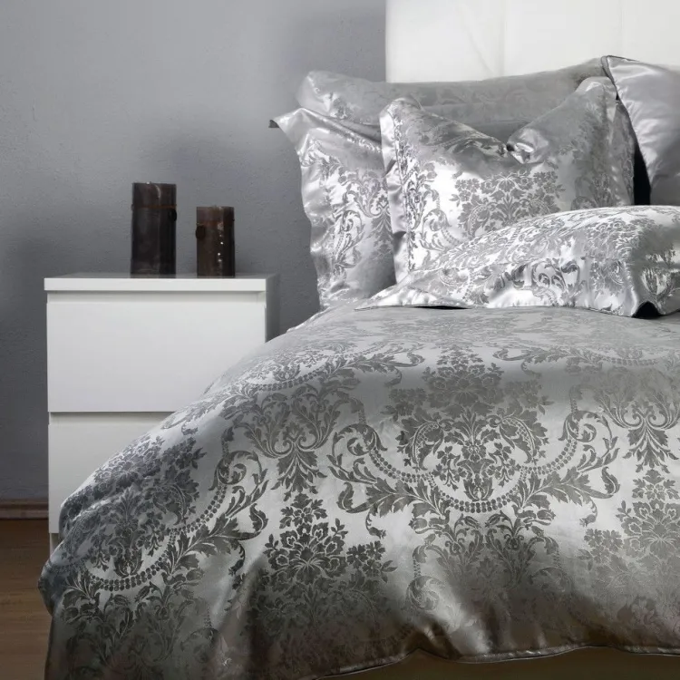 Die garngefärbt gewebte Bettwäsche Portofino Ash besteht aus reiner Seide. Der edel glänzende Jacquard-Satin mit einem fürstlichen Jacquardmuster aus feiner Maulbeerseide ist luxuriös und elegant. Das hochwertige Gewebe aus 100% Seide fällt fließend und hat einen edlen Glanz. Bettwäsche aus reiner Seide ist hautsympathisch und temperaturausgleichend und damit sowohl im Sommer als auch im Winter angenehm. Diese Seidenbettwäsche hat ein Flächengewicht von ca. 110g/m².