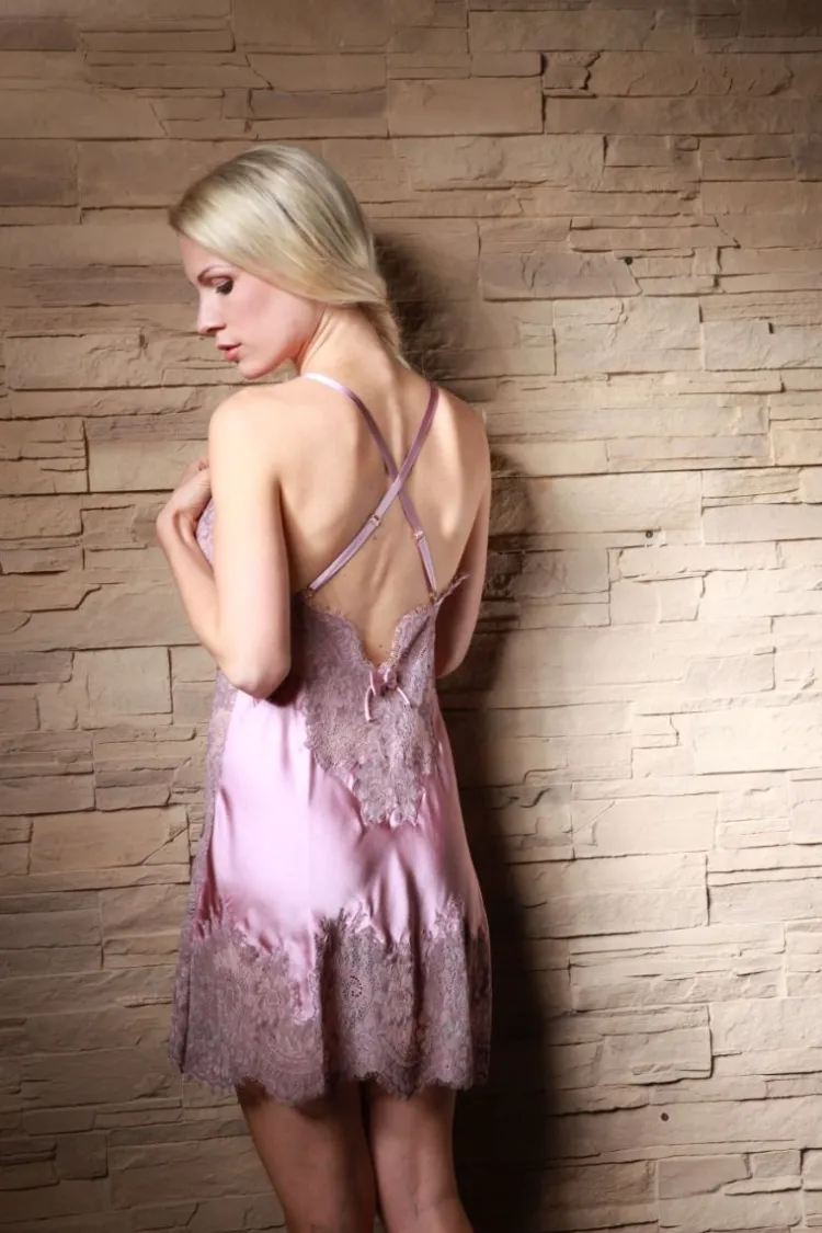 Dieses verführerische kurze Seiden-Negligé ist aus exquisiter Stretch-Seide (95% Seide, 5% Elasthan) gefertigt. Das Nachthemd (Länge ca. 90 cm) ist besonders reich mit einer feinen Eye-Lash Spitze besetzt. Die Spitze wurde dabei als sogenannte „inkrustierte Spitze“ in den Satin eingearbeitet. Für diese aufwändige Verarbeitungsart werden Spitze und Stoff von Hand für jedes Teil einzeln passgenau ausgeschnitten und erst dann vernäht.