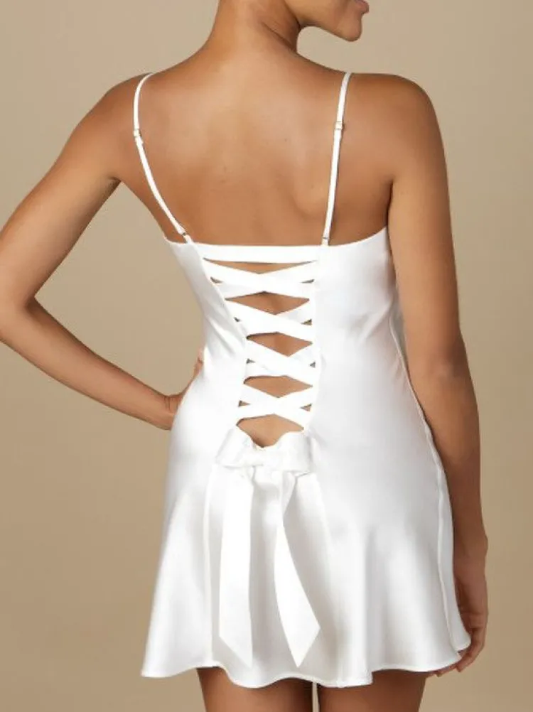 Das Highlight dieses ansonsten schlichten Nachthemdes ist die raffinierte Rückengestaltung mit überkreuzten, geflochtenen Bändern und einer großen Schleife.