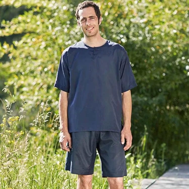 Den kurzen Reisepyjama für Herren gibt es in der Farbe tuareg (dunkles Blau) und in Größe M bis XXL. Dieser Reiseschlafanzug im klassischen Schnitt hat kurze Ärmel und kurze Beine. Das Oberteil hat eine kurze Knopfleiste mit zwei Knöpfen am Ausschnitt und die Hose hat einen anpassbaren Bund mit Zugbändern . Mit dem Packmaß von 14x13x5 cm und einem Gesamtgewicht von nur 112 bis 137 g (je nach Größe) fällt dieser handliche Reiseschlafanzug aus Seiden-Mischgewebe im Gepäck kaum auf. Der Pyjama wird gefaltet in einem kleinen Netzbeutel mit Zugband geliefert.