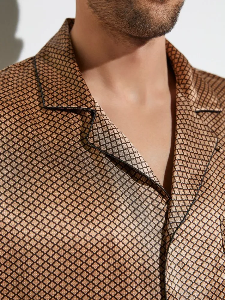 Das Oberteil des Seiden-Pyjamas ist ca. 80 cm lang und mit schönen, breiten doppelten Säumen gearbeitet. Der Revers-Kragen mit leichtem Einschnitt und der aufgesetzten Brusttasche geben dem edlen Schlafanzug seine elegante Erscheinung. Den letzten Schliff erhält der Herren-Pyjama mit den Logo-geprägten Perlmutt-Knöpfen, mit denen das Schlafanzug-Oberteil geknöpft wird. Die Pyjama-Hose ist gerade geschnitten und verfügt über einen Eingriff, der mit einem Knopf geschlossen ist.