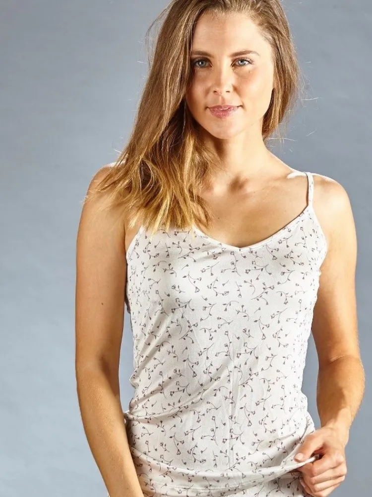 Das Seidentop besteht aus Feinjersey aus 100% Seide. Dieses feine Seidenunterhemd aus der Seidenunterwäsche Kollektion von Kokon Zwo hat Spaghetti-Träger und überzeugt durch das weiche und besonders leichte Material. Dieses Modell ist vom Schnitt her identisch mit dem Top aus der Basic Kollektion von Kokon Zwo, hat aber einen zeitlich nur begrenzt erhältlichen Print von kleinen Blumen.