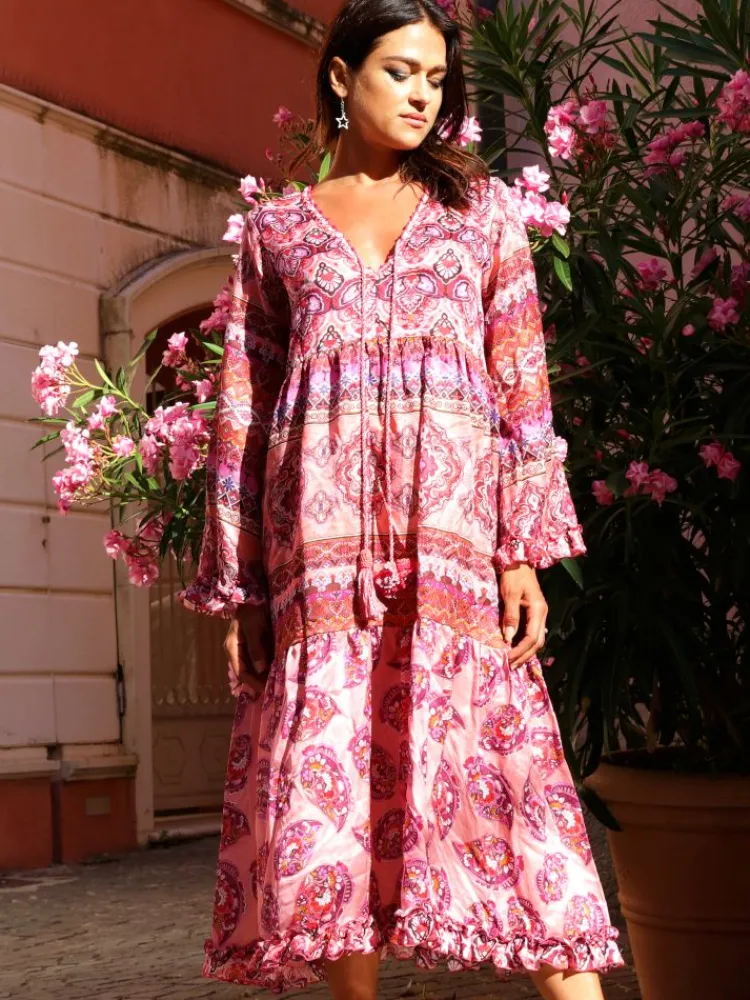 Das halblange Strandkleid Berenice Rosa der italienischen Luxus-Marke Laetitia Beachwear ist aus feinem Batist (65% Baumwolle, 35 % Seide) gefertigt. Das exklusive Kleid ist in einem Mustermix mit floralen und Paisley-Mustern gearbeitet und in echter Handarbeit mit Häkelsäumen verziert. Der Ausschnitt ist umhäkelt und die weiten Ärmelenden und der untere Saum haben einen Rüschenrand.