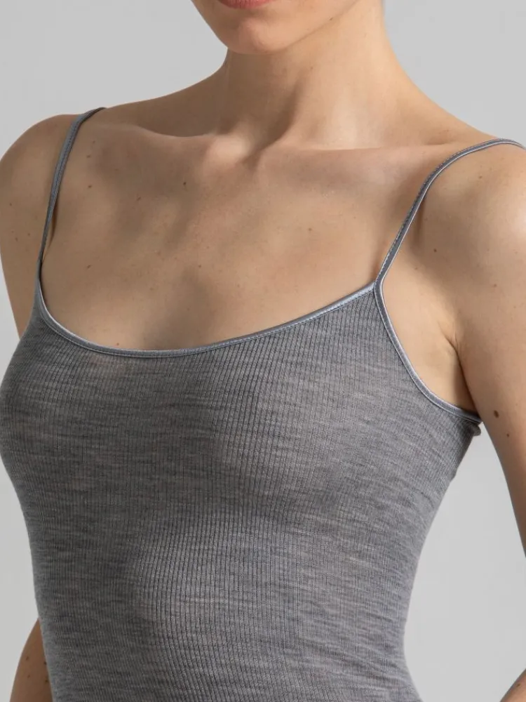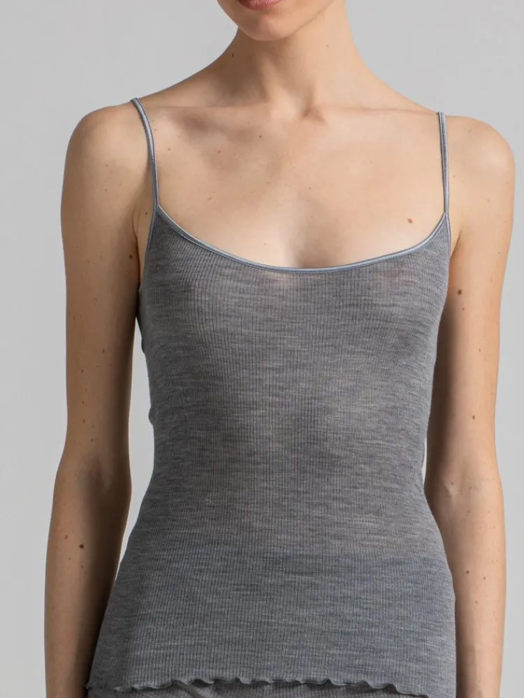 Dieses hochwertige Wolle-Seide Spaghettiträger Top Romilda von Boglietti ist aus einem hochwertigen, rundgestrickten Rippjersey gefertigt. Das Top hat eine Länge von ca. 60 cm und verstellbare Spaghettiträger aus Paspel. Der Ausschnitt ist auch mit Paspel verziert.