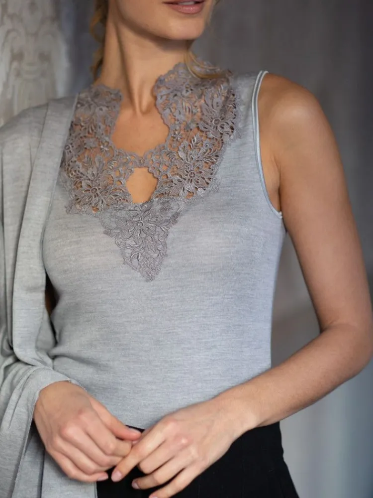 Das ärmellose Top Wolle-Seide besteht aus einem besonders hochwertigen glatten Jersey aus 70% extrafeiner Merinowolle und 30% Seide in Kombination mit einer hochwertigen Makramee Spitze. Dieses edle Top ist ärmellos, hat eine Gesamtlänge von ca. 60 cm und einen V-Ausschnitt mit Spitzenbesatz.