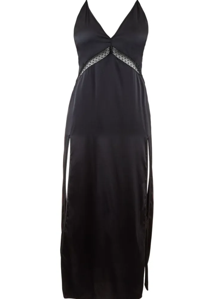 Unter der Brust schmückt ein transparenter Einsatz aus Guipure Spitze das Oberteil des Nachtkleides und verleiht ihm somit ein sinnliches Detail. Der tief ausgeschnittene Rücken enthüllt die Haut auf elegante, verführerische Weise. Durch die aufregenden Beinschlitze an beiden Seiten gewinnt das elegante Nachtkleid an Raffinesse und Modernität. Das Seiden-Negligé ist ca. 120 cm lang und hat feine, verstellbare Spaghettiträger mit kleinen goldenen Zamakringen.