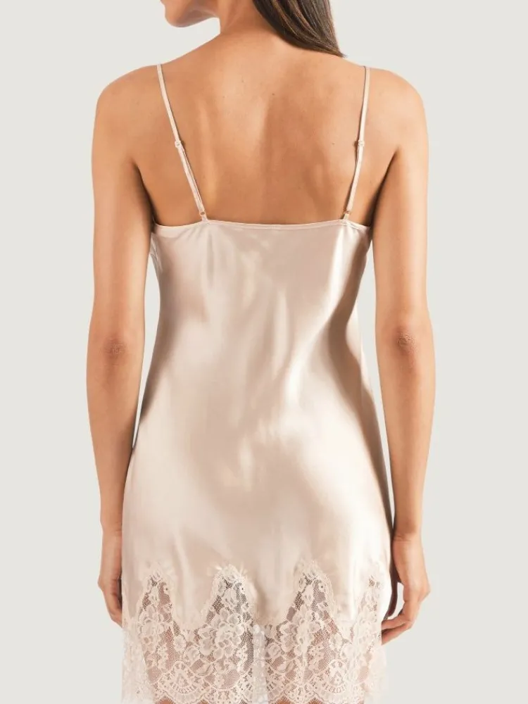 Das Negligé ist am Decolleté und zusätzlich am Saum umlaufend mit der weichen Spitze benäht. Durch die feine Verarbeitung und den körpernahen Schnitt ist dieses Modell auch als Unterkleid tragbar.