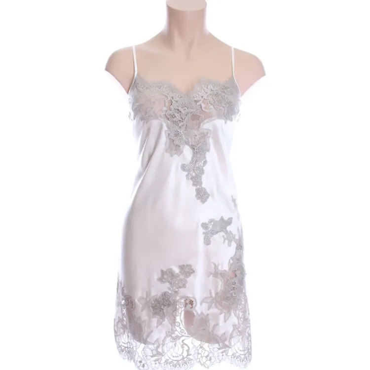 Ein kurzes Negligé der Luxusklasse ist das Seiden- Nachthemd Demon No. 2 der französischen Edel-Marke Marjolaine. Der edle Seidensatin aus Stretchseide (98% Seide, 2% Elasthan) wurde mit einer besonders interessanten, mit Spitzenblumen benähten Eye-Lash-Spitze zu einer aufregenden Nachtwäsche verarbeitet.