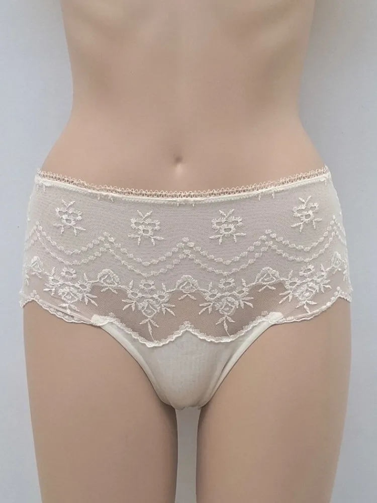 Dieser Slip in geradliniger Shorty-Form ist unten aus doppellagigem Tüll gestaltet und hat oben ein umlaufendes, breites Band aus bestickter Tüllspitze. Die Naht ist hinten, dadurch ist der Slip seitlich nahtlos. Der Slip ist in schwarz und champagner creme-weiß in den folgenden Größen erhältlich: