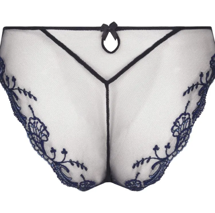 Der bezaubernde Slip ist vorne aus feiner Seide mit besticktem Tüll. Die Rückseite ist komplett aus Tüll und daher leicht transparent. Die schönen Stickereien sind sowohl vorne, als auch hinten an den Rändern des Slips angebracht. So wird ein einzigartiger Look geschaffen, der sich von einem gewöhnlichen Slip unterscheidet. Hinten ziert zusätzlich ein kleines Cut-Out mit einer zarten Zierschleife den Slip. Das Wäschenunterteil hat einen weichen Baumwollzwickel. Der schöne Schnitt, die hochwertigen Materialien und zarten Details machen aus diesem Slip ein aufregendes, unwiderstehliches Dessousteil, dass sowohl für den Alltag als auch für besondere Anlässe perfekt geeignet ist. Aus dieser zarten Kollektion gibt es weitere, ergänzende Kombinationsteile seperat in unserem Shop.