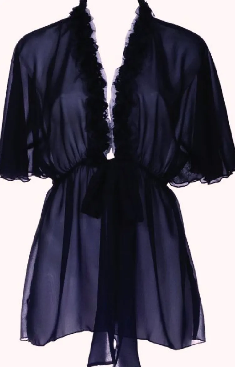 Besonders feminine, kurze Seidenrobe aus hauchzartem, transparentem Seiden- Chiffon aus der Wäsche-Serie „Parisienne“ von Sally Jones. Die Robe aus 100% Seide ist am Kragen umlaufend mit verspielten Seiden-Blumen benäht. Diese verführerische Seidenwäsche ist in den Größen XS-XL und in den Farben schwarz oder apricot erhältlich.