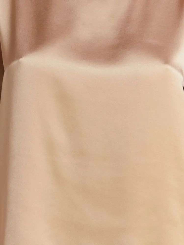 Dieses elegante Seiden-Top ist aus hochwertigem Seidensatin (100 % Seide) gefertigt. Das elegante Seidentop ist fein genäht und in klassischen oder modischen Farben erhältlich. Das Top mit breiteren Trägern hat einen assymetrischen Schnitt und ist vorne etwa 58 cm lang und hinten mit etwa 70 cm etwas länger geschnitten. Am Ausschnitt hinten wird das Top mit einem kleinen Knöpfchen geschlossen.