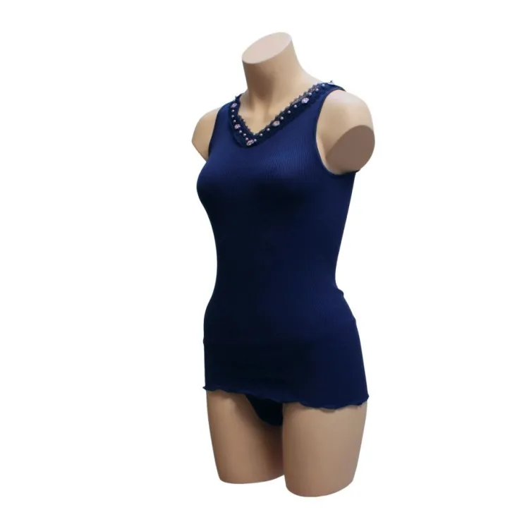 Das Seide-Baumwolle Unterhemd Fiocca ist aus hautsympathischen Rippjersey in einer feinen Seide-Baumwolle Mischung (50% Seide) hergestellt. Dieses temperierende Unterziehshirt mit breiten Trägern aus der Seide-Baumwolle Unterwäsche Kollektion Fiocca von Gattina Dessous kann zum Drunterziehen oder als Top verwendet werden. Am Ausschnitt ist es mit einer Applikation aus kleinen Satinblumen und aufgestickten Kunstperlen verziert.