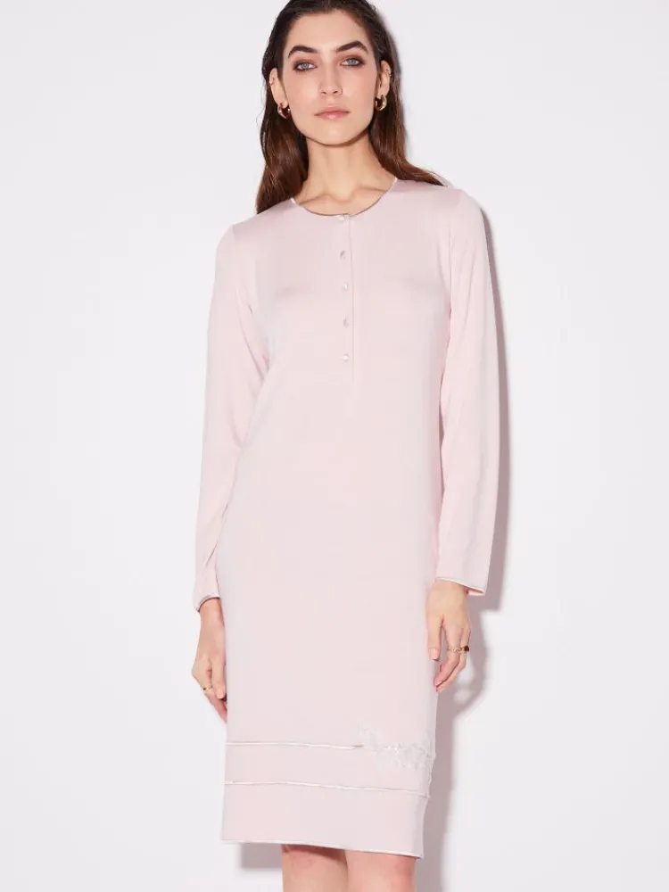 Das knielange Nachthemd von Chiara Fiorini besteht aus weichem Micro-Modal in einer hautsympathischen, elastischen Jersey-Qualität (96% Modal, 4% Elasthan). Es ist Made in Italy und in den Größen 36 bis 50 erhältlich. Dieses Langarm Nachthemd ist ca. 100 cm lang, hat lange Ärmel und einen runden Ausschnitt. Die Knopfleiste mit stoffüberzogenen Knöpfen reicht kurz bis unter die Brust. Über dem Knie wird das Nachthemd mit kontrastierenden Ziernähten und einer floralen Spitze abgerundet.