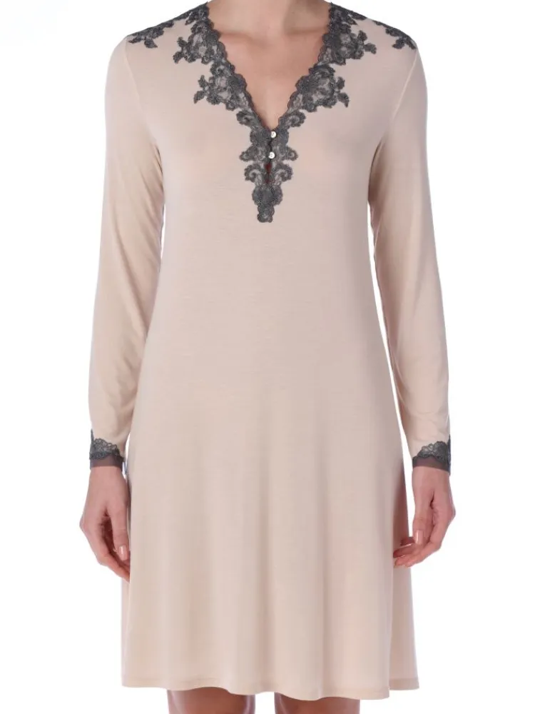 Das Nachtkleid Ines hat lange Ärmel, die mit floraler Spitze verziert sind. Der runde Ausschnitt ist mit einer grauen Tüll-Blütenspitze gestaltet. Das Nachthemd hat einen bequemen Schnitt und ist mit ca. 95 cm etwa knielang.