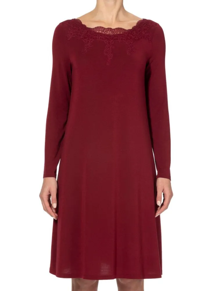 Dieses Nachtkleid ist in der Farben bordeaux weinrot und in den Größen 1 bis 6 erhältlich.