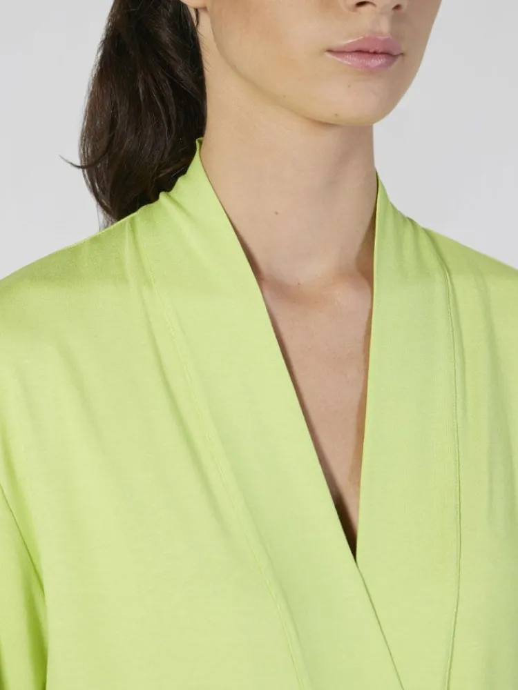 Der Morgenmantel Basic hat lange Ärmel. Er wird gewickelt getragen und mit einem Bindegürtel geschlossen. Er hat eine zeitlos elegante, klassische Form und ist in verschiedenen Längen und in den Farben kiwigrün, schwarz oder koralle pink erhältlich.