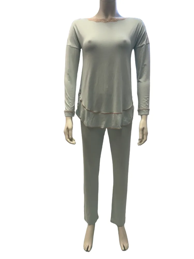 Der Pyjama Assisi von Paladini ist bei uns in einem schönen Mintgrün in den deutschen Damengrößen 36 bis 44 erhältlich. Da dieser Pyjama zur modischen Kollektion von Paladini gehört, sind ausverkaufte Größen leider nicht nachbestellbar.