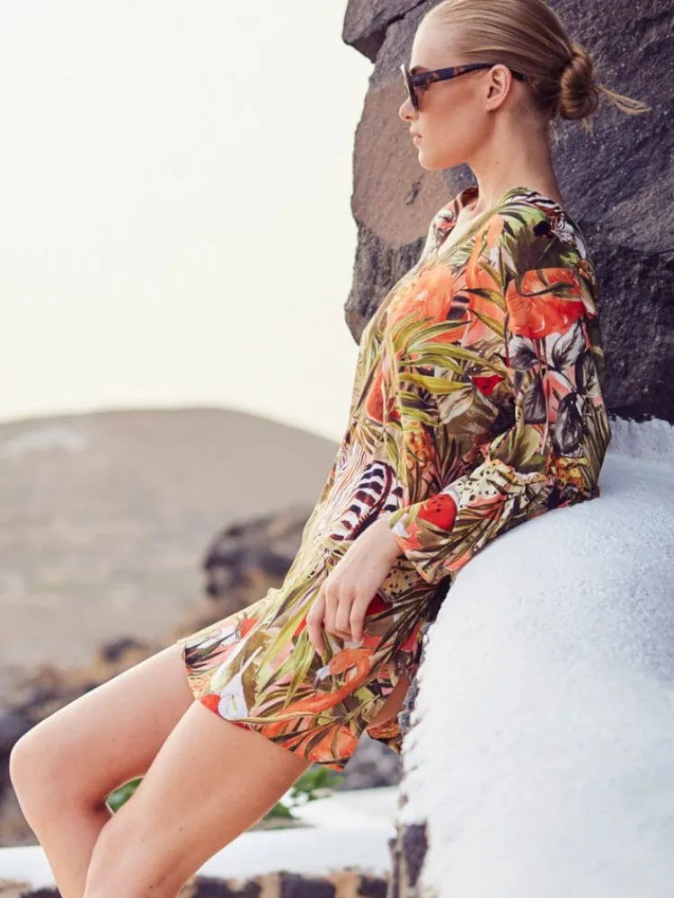 Sommerliche Strand-Tunika Zebra in Paradise mit langen Ärmeln. Diese luftige Tunika ist aus bedrucktem Viscose Batist gefertigt und ist perfekt für sommerliche Temperaturen… Die Tunika hat lange Ärmel und eine Länge von ca. 85 cm. Der legere Schnitt und der exklusive Druck machen diese Tunika zu einer edlen Sommerbluse oder zu einem lässigen Strand-Accessoir. Sie ist etwas länger als eine gewöhnliche Bluse geschnitten und daher auch als Schlafshirt verwendbar.