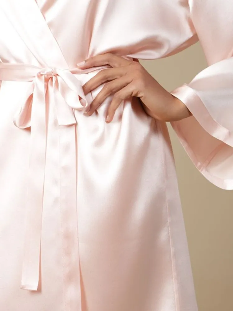 Der kurze Seidenmorgenmantel Laser hat lange Ärmel, ein schmales Revers und wird mit einem Bindegürtel geschlossen. Er ist aus der Basic Kollektion Soie Unie von Marjolaine und in Uni-Farben erhältlich.
