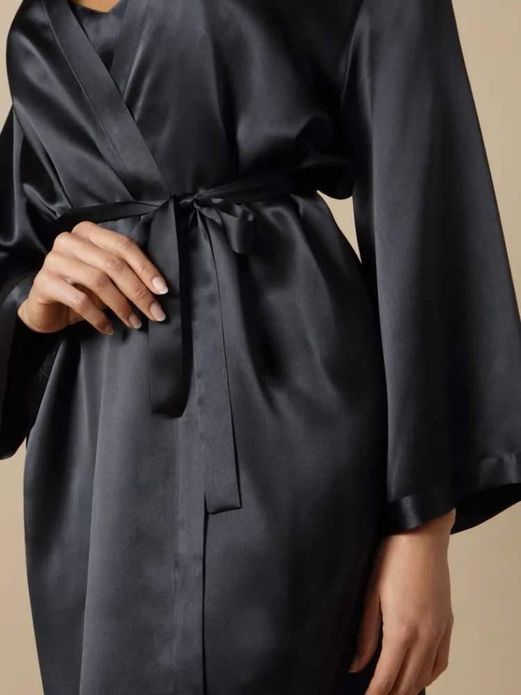 Der kurze Seidenmorgenmantel Laser hat lange Ärmel, ein schmales Revers und wird mit einem Bindegürtel geschlossen. Er ist aus der Basic Kollektion Soie Unie von Marjolaine und in Uni-Farben erhältlich.