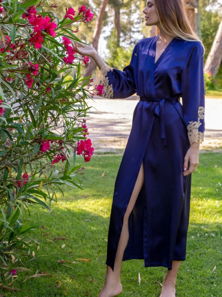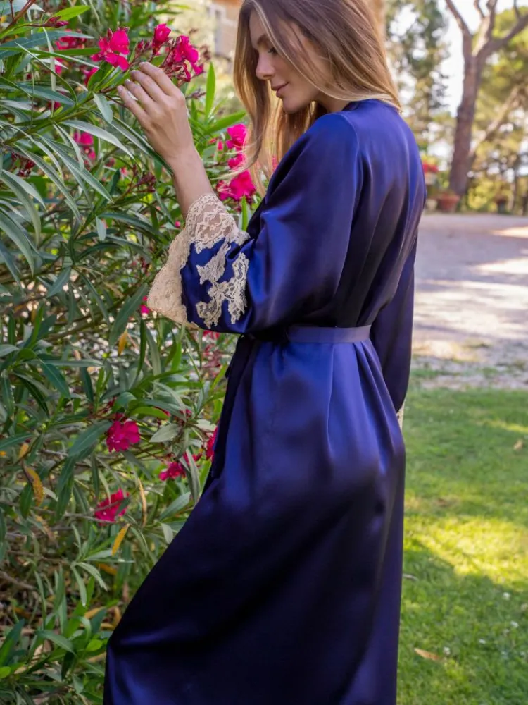100% Seide Morgenmantel Marjolie No. 9 mit Spitze Marjolaine