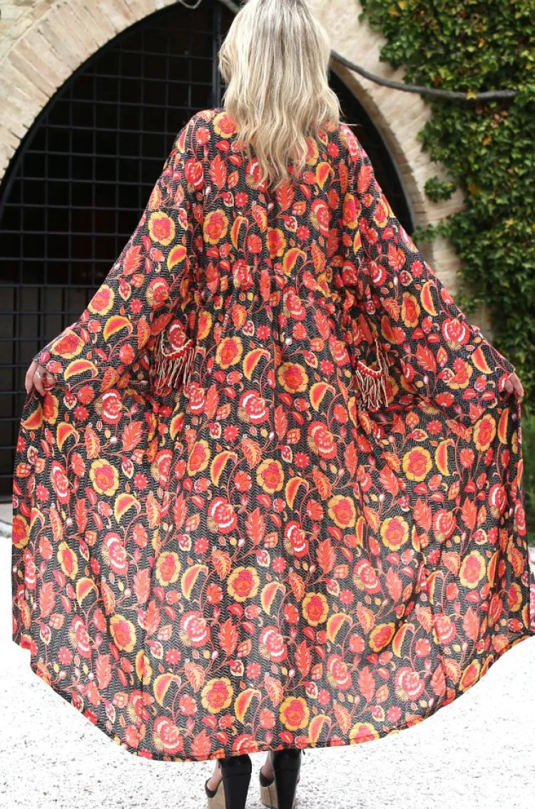Der lange Kimono Aurora in schwarz-rot der italienischen Luxus-Marke Laetitia Beachwear ist aus feinem Batist (65% Baumwolle, 35 % Seide) gefertigt. Der exklusive Kimono ist mit einem floralen Print bedruckt und hat einen Bindegürtel. Die Häkelsäume an den Taschen sind in echter Handarbeit gefertigt. Der Ausschnitt ist verziert mit Häkelblumen und Zierperlen.