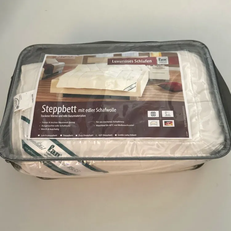Die Bettdecke wird in einer textilen Bettwarentasche geliefert, in welcher sie staubgeschützt aufbewahrt werden kann, wenn sie jahreszeitlich nicht benötigt wird.