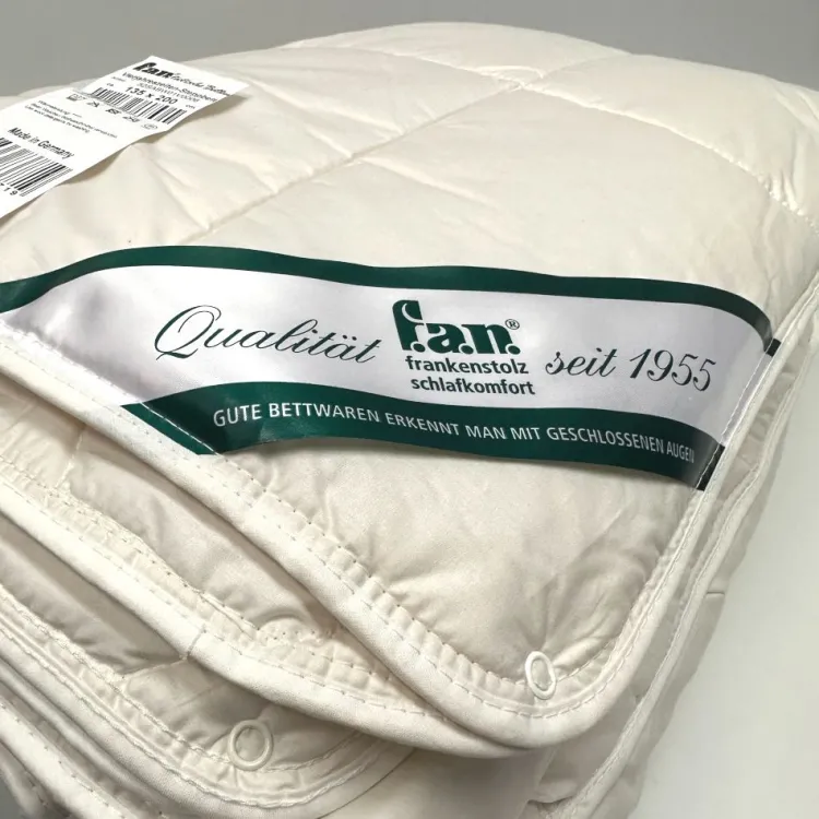 Diese f.a.n. Frankenstolz 4-Jahreszeiten Bettdecke besteht aus einer leichten Sommerbettdecke (1-2 Wärmepunkte) und einer mittelwarmen Bettdecke für die Übergangszeit (3-4 Wärmepunkte) mit Füllung aus Schafwolle (97%) und einem Oberstoff aus 100% Baumwollebatist. Beide Bettdecken lassen sich über Druckknöpfe zu einem Winterbett verbinden.