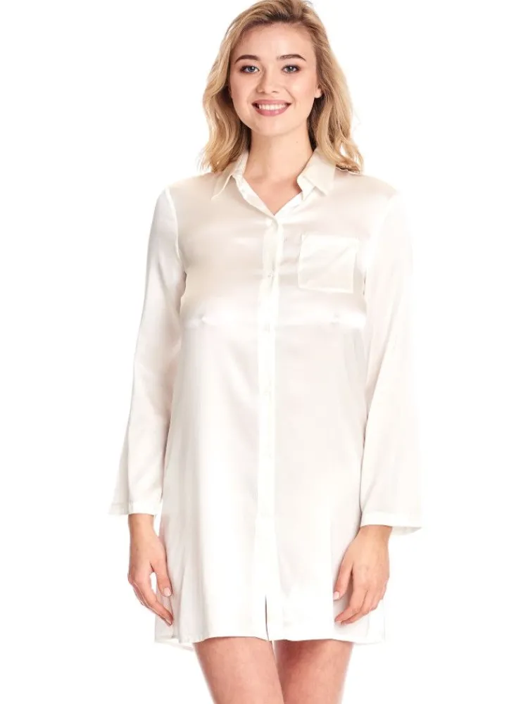 Das Sleepshirt mit langen Ärmeln aus der verführerischen Serie von Gattina besteht aus fein glänzendem Stretch-Seidensatin. Es ist erhältlich in klassischen Uni-Farben, jeweils in den Größen 36 bis 48 (deutsche Damenkonfektionsgrößen). Auf der Vorderseite ist es durchgehend geknöpft und kann hochgeschlossen werden. Es hat lange Ärmel und eine Gesamtlänge von ca. 90 cm mit einem rundgeschnittenen Saum. Der klassische Schnitt und die bequeme Passform machen aus diesem Sleepshirt ein Nachthemd für das ganze Jahr.