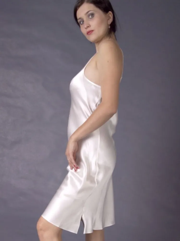 Dieses verführerische Seiden-Nachthemd ist aus hochwertigem feingewebtem Seidensatin (55% Seide und 45% Baumwolle) gefertigt. Das knielange Nachthemd hat verstellbare Spaghetti-Träger und ist am Saum seitlich geschlitzt. Dieses Seidennachthemd gibt es in klassischem Schwarz oder Champagner-Weiß.