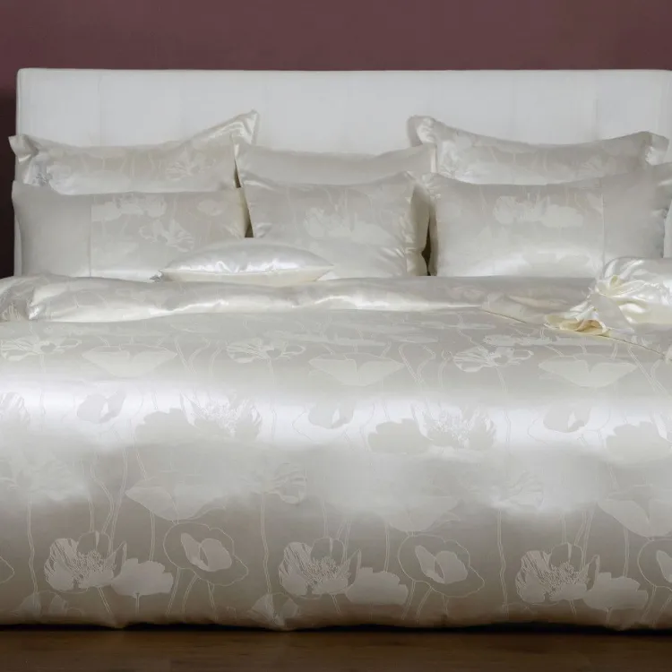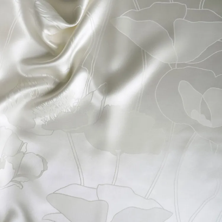Die klassisch natur-weiße Bettwäsche Adele besteht aus reiner Seide. Der edel glänzende Jacquard-Satin mit einem modernen Mohnblüten Muster aus feiner Maulbeerseide ist stylisch und elegant. Das hochwertige Gewebe aus 100% Seide fällt fließend und hat einen edlen Glanz. Bettwäsche aus reiner Seide ist hautsympathisch und temperaturausgleichend und damit sowohl im Sommer als auch im Winter angenehm. Diese Seidenbettwäsche hat ein Flächengewicht von ca. 100g/m².