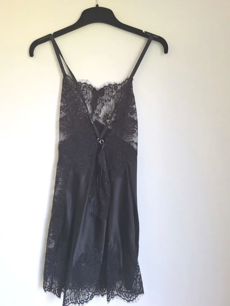 Die Büste ist transparent komplett aus Spitze gearbeitet. Auf der Rückseite hat dieses Seidennegligé einen tiefen Rücken-Ausschnitt welcher mit Spitze eingefasst ist. Die Träger sind im Rücken überkreuzt und können in den Länge verstellt werden.
