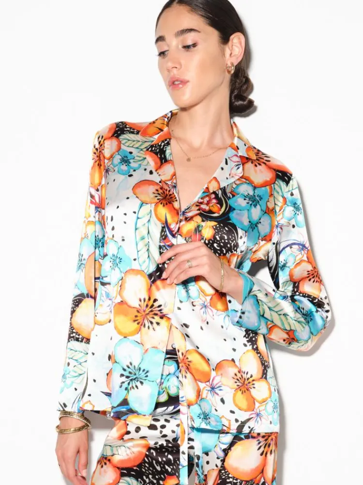 Dieser exclusive Seidenschlafanzug ist ein Teil aus der limitierten Sommer Kollektion von Chiara Fiorini. Er ist in weiß-bunt erhältlich. Das Material ist fein, weich und glänzend und hat einen schönen Blumen Druck. Das Oberteil hat eine Länge von ca. 65 cm.